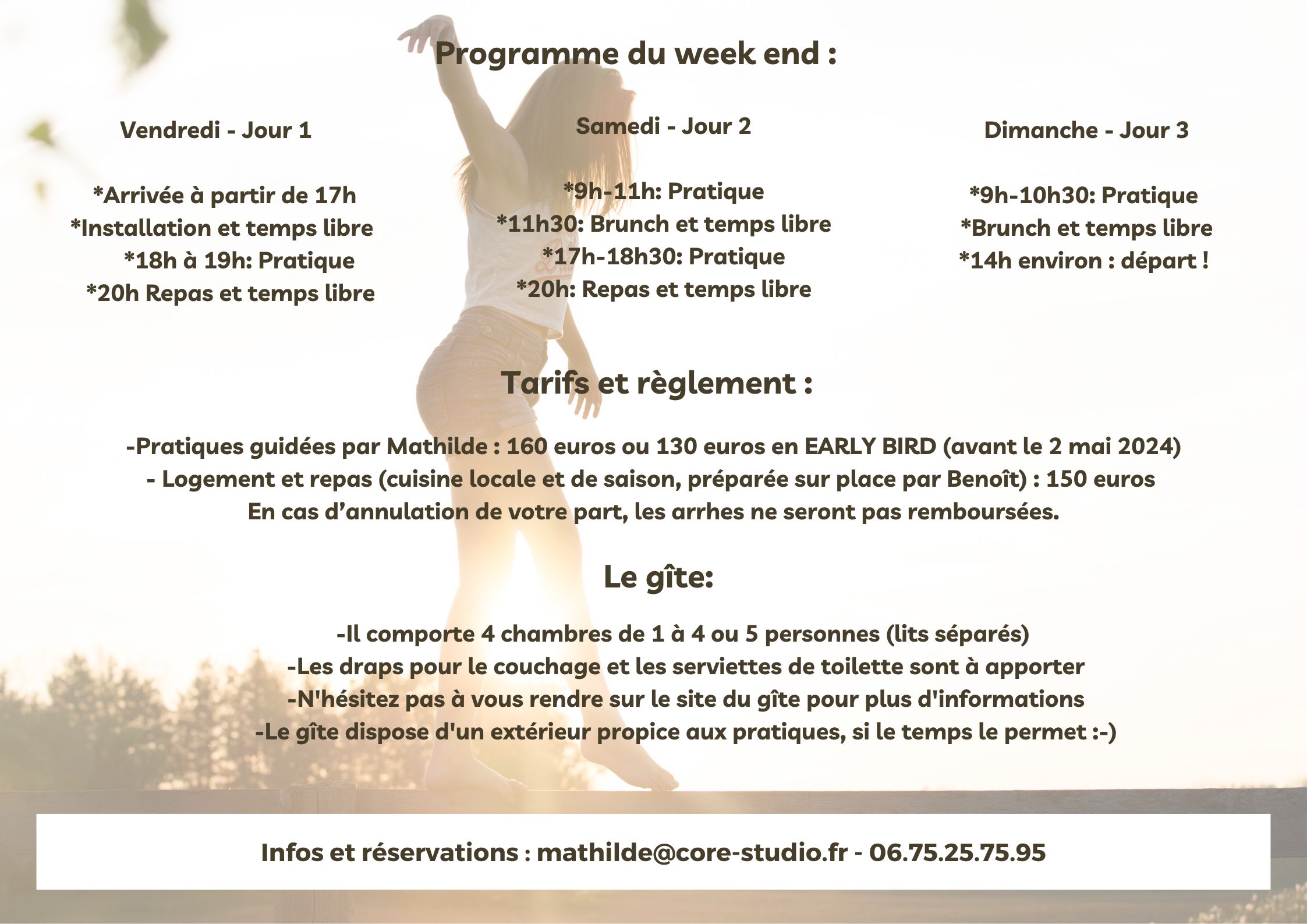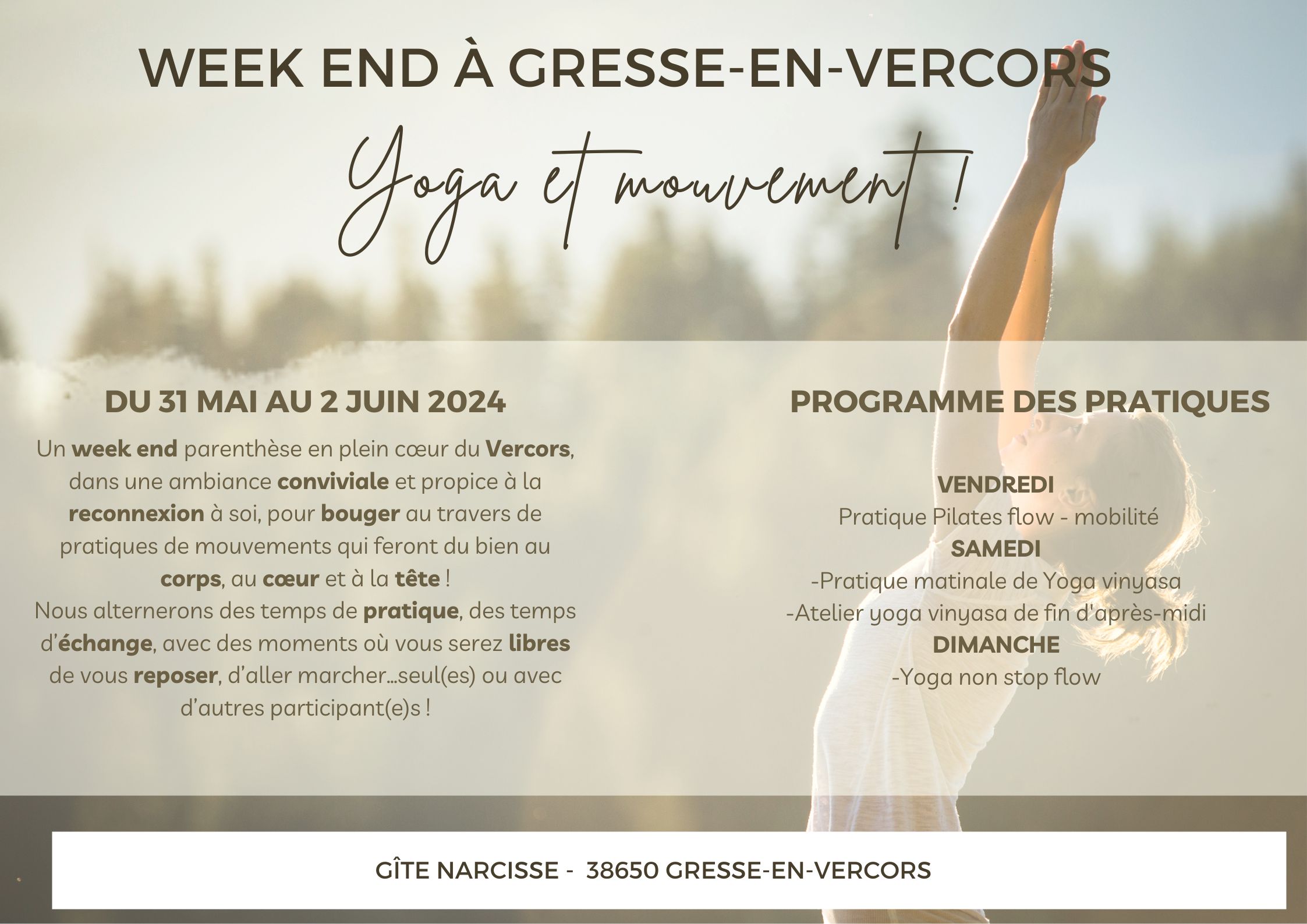 Le voici !!! Vous trouverez ci-dessous les informations pour le week end mouvement et ressourcement qui aura lieu ce printemps !